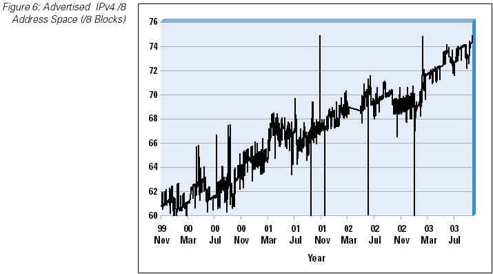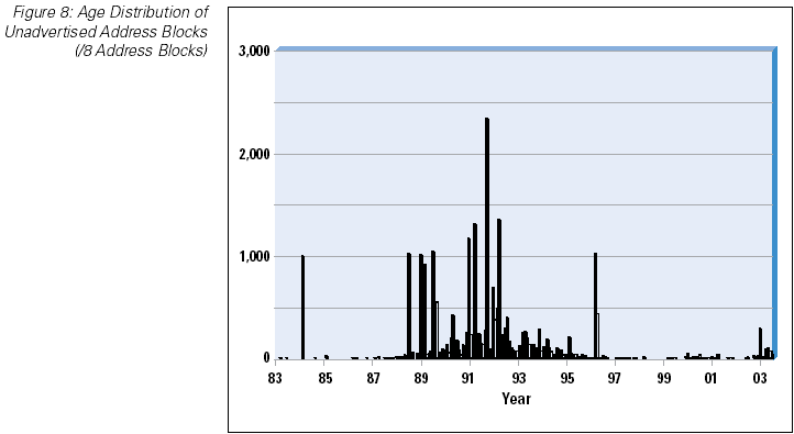 We can look back through the RIR allocation data and look at the allocation dates of unannounced address space (Figure 8). This view indicates that the bulk of the space is a legacy of earlier address allocation practices, and that since 1997, when the RIR operation was fully established, there is an almost complete mapping of RIR allocated address space to BGP routing announcements. The recent 2003 data indicates that there is some lag between recent allocations and BGP announcements, most probably due to the time lag between an LIR receiving an allocation and subsequent assignments to end users and advertisement in the routing table.