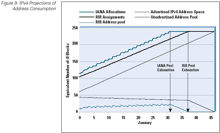 One of those stories that keeps on appearing from time to time is the claim that somewhere in the world, or even all over the world, we are "running out of IP addresses," referring to the consumption of unallocated IPv4 addresses [1]. In one sense this is a pretty safe claim, in that the IPv4 address pool is indeed finite, and, as the IPv4 Internet grows it makes continual demands on previously unallocated address space. So the claim that the space will be exhausted at some time in the future is a relatively safe prediction. But the critical question is not "if" but "when," because this is a question upon which many of our current technology choices are based.