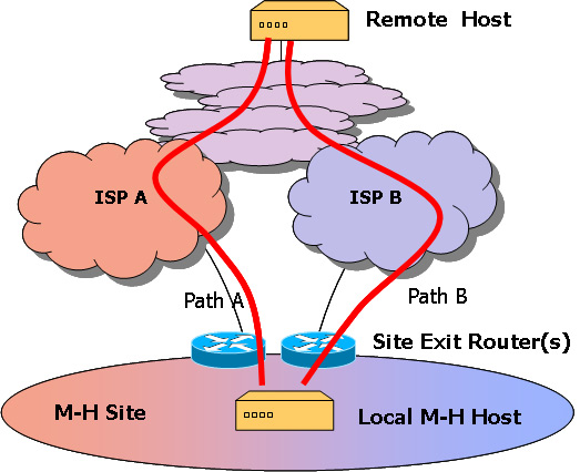 This is starting to get intriguing. Under these constraints the remote host, R, when it wants to send a packet to the multi-homed host via path A must use an address for the host drawn from ISP A's aggregate address block, and when it wants to send a packet via path B, then the destination address in the packet header is drawn from the ISP B's address block. How can host R know that the two addresses actually refer to the same remote host? How can R know when to switch from one address to the other? How can these in-session address changes be supported in a manner that prevents session hijacking by various forms of man-in-the-middle attacks?
