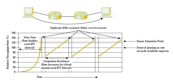 Let head back to the basics of TCP to understand some of the issues with very high speed TCP. TCP operates in one of two states, that of slow start and congestion avoidance.