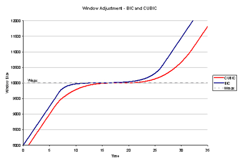 Figure 10 shows the relative adjustments for BIC and CUBIC, using a single time base. The essential difference between the two algorithms is evident in that the CUBIC algorithm attempts to reduce the amount of change in the window size when near the value where packet drop was previously encountered.