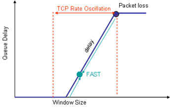 FAST attempts to stabilise the packet flow at a rate that also stabilises queue delay, by basing its window adjustment, and therefore its sending rate, such that the RTT interval is stabilized. The window response function is based on adjusting the window size by the proportionate amount that the current RTT varies from the average RTT measurement. If the current RTT is lower than the average, then window size is increased, and if the current RTT is higher then window size is decreased. The amount of window adjustment is based on the proportionate difference between the two values, leading to the observation that FAST exponentially converges to a base RTT flow state. By comparison, conventional TCP has no converged state, but instead oscillates between the rate at which packet loss occurs and some lower rate. (Figure 12)