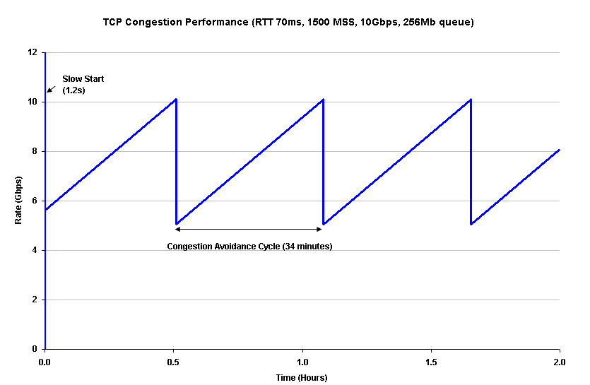 But what happens when two systems are at opposite sides of a continent with a high speed path between them? How long does it take for a single TCP session to get up to a data transfer rate of 10Gbps? Can a single session operate at a sustained rate of 10Gbps?