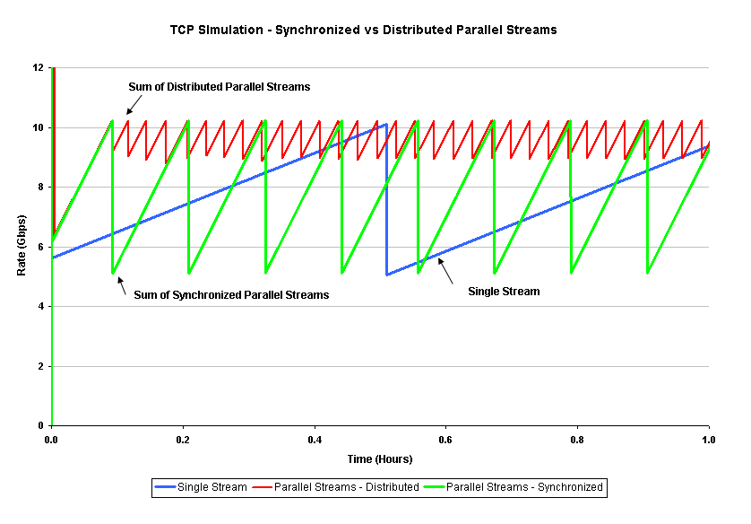 The two extremes, evenly distributed and tightly synchronized multiple streams are indicated in Figure 5. The average throughput of parallel synchronized streams is the same as a single stream over extended periods in this simulation, and both are certainly far worse than an evenly distributed set of parallel streams.