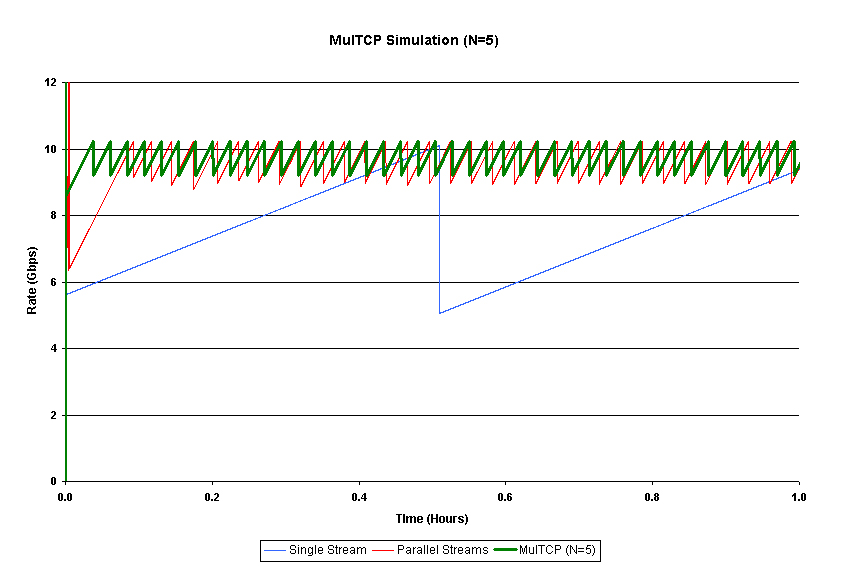 The essential characteristics of the aggregate flow is that, under lossless conditions the data flow of N parallel sessions increases at a rate N times faster than a single session in congestion avoidance mode. Also the response to an isolated loss event is that of rate halving of a single flow, so that the total flow rate under ideal conditions is between R and R * (2N-1)/2N, or a long term average throughput of R * (4N-1)/4N. For N = 100 our theoretical 10Gbps connection could now operate at 9.9Gbps.