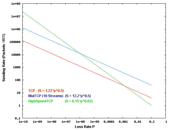 But perhaps the desired response is not to shift the TCP rate response by a fixed factor of N, as is the intent with MulTCP, but to adaptively increase the sending rate through increasing values of N as the loss rate falls. The proposition made by HighSpeed TCP is to propose a TCP response function that preserves the fixed relationship between the logarithm of the sending rate and the logarithm of the packet loss rate, but alters the slope of the function, such that TCP increases its congestion avoidance increment as the packet loss rate falls. This relationship is shown in Figure 7, where the log of the sending rate is compared to the log of the packet loss rate. MulTCP preserves the same relationship between the log of the sending rate and the log of the packet loss rate, but alters the offset, while changing the value of the exponent of the packet loss rate causes a different slope to the rate equation.