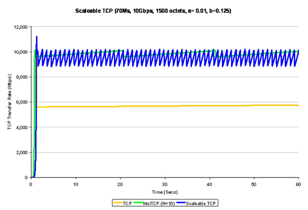 In Scalable TCP, for each ack the congestion window is inflated by the constant value a, and upon packet loss the window is reduced by the fraction b. The relative performance of Scalable TCP as compared to conventional TCP and MulTCP is shown in Figure 9.