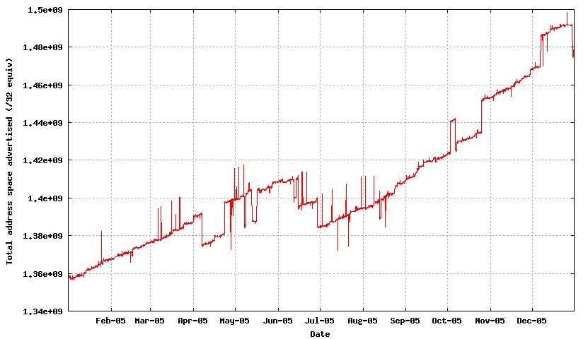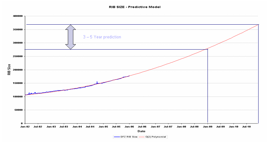 However the IPv4 trends for 2005 are a source of some concern. How big can the Internet grow in the coming years? Will we continue to be able to deploy routers in the default-free routing zone of the Internet that can comfortably route the Internet. Can we add additional functionality into the routing system and still stay within comfortable limits of the capability of the routing system and the routers? If you are an ISP and are considering purchasing new 'core' routers what capabilities should you specify for an operational lifetime of 2 years? How about for the next 5 years? And if you are a router vendor designing routing products for the market 3 or 5 years in the future what capacity should you build into the router? How much processing capacity should you plan for to support default-free BGP? How much memory is necessary?