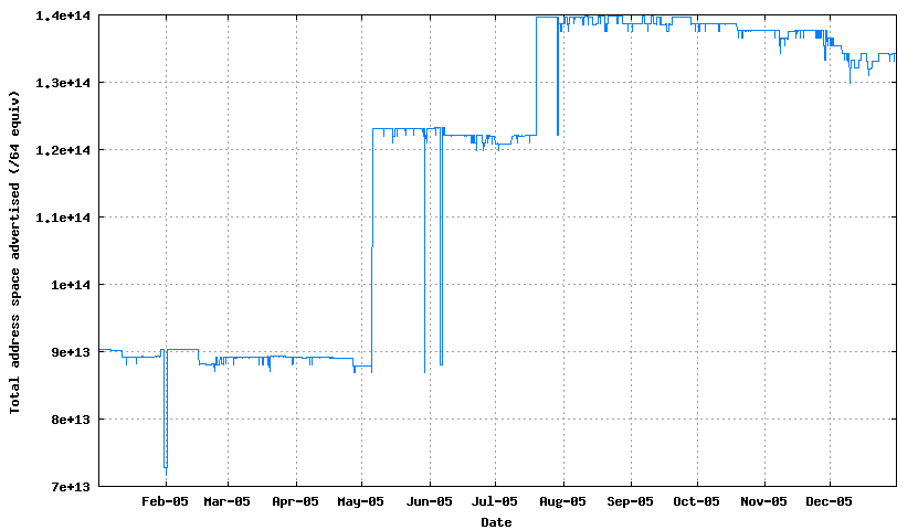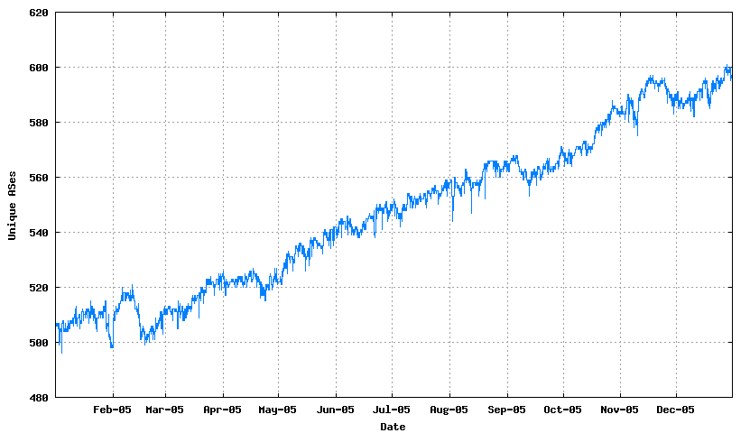 There are a large number of measurements of the BGP routing table that can describe the dimensions and dynamic characteristics of the inter-domain internet. Here I'd like to concentrate on the use and behaviour of the protocol itself, so in this article I will take a look at BGP across the year of 2005, and see how well BGP fared.