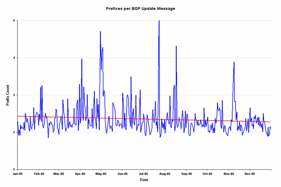 Why has the number of Update messages increased so significantly? The daily update rate has doubled over the year, while the size of the routing table itself increased by a much smaller growth factor of 18%. Each BGP update messages contains a number of prefixes. One question to ask is whether the number of prefixes in each update message is increasing or decreasing on average. The daily average number of prefixes per update message is The next area of interest is the average number of prefixes contained in each update message. On average there were between 8.1 and 8.3 prefixes per originating AS across 2005, and if it is really the case that prefixes are managed in a manner such that each AS has a single coherent routing policy then we would expect to see a relatively consistent number of prefixes in each BGP update message. This is not the case, and the number of prefixes per update message declined over the year.