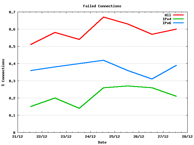 The connection failure rate for all connections is an average of 0.6% of all connection attempts. In terms of counts, the failure rate is an average of 126 connection attempts out of an average total of some 22,000 unique connection attempts per day. The level of failed IPv6 connection attempts, an average of 82 connection failures per day, is approximately double that of the number of failed IPv4 connection attempts, which number an average of 45 connection failures per day.
