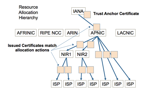 The hierarchy of the RPKI is based on the administrative resource allocation hierarchy, where resources are distributed from the IANA to the RIRs, to Local Internet Registries (LIRs) and end users. The RPKI mirrors this allocation hierarchy with certificates that match current resource allocations (Figure 1).