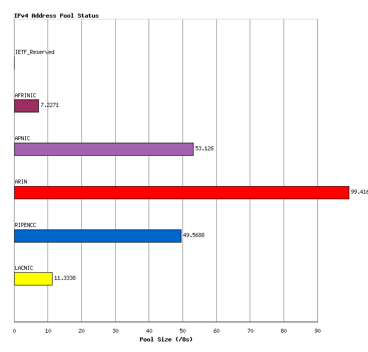 This allocated number pool is managed by the Regional Internet Registries, (RIRs) and the breakdown of IANA allocated address blocks to each of the RIRs is shown in Figure 2.