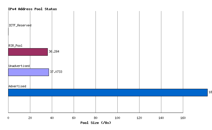 The remaining 220.922 /8 address blocks are available for use in the public IPv4 Internet. The current status of the total IPv4 address space is indicated in Figure 1.