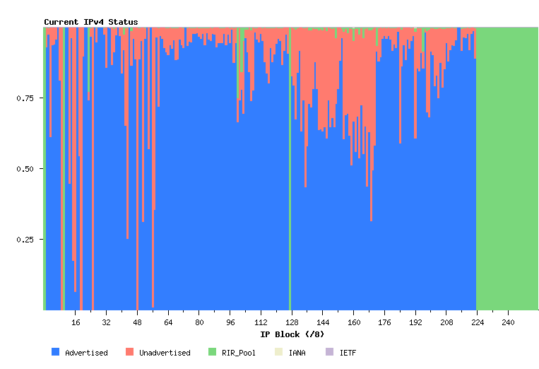 Another view of the address state pools is by grouping the address space into a sequence of /8s, and looking at state sub totals within each /8 address block. The following view shows the current status of the IPv4 address space as 256 /8 columns each describing a pool of 16,777,216 addresses.