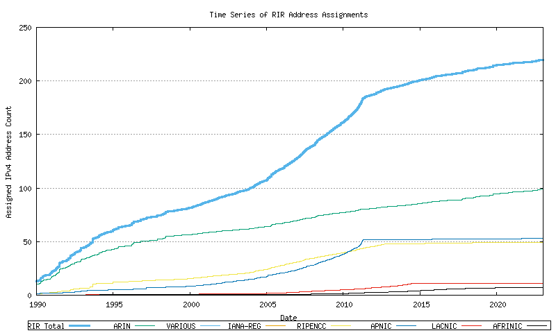 RIRs perform assignments of address blocks to ISPs and local Internet registries. The cumulative number of assigned addresses over time is shown in Figure 8.