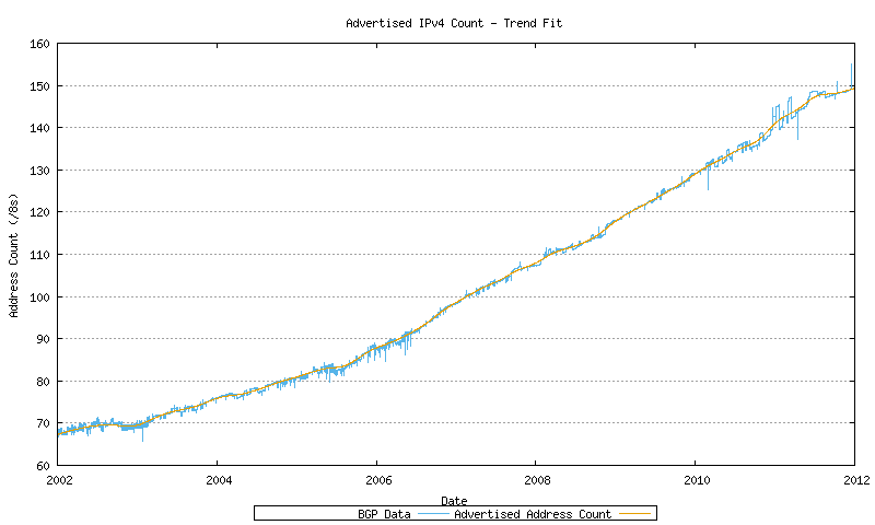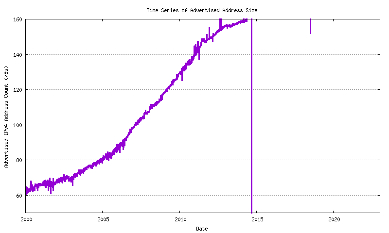 The next data set is total span of address space advertised in the BGP routing table over time. The data has been collected since late 1999. This is shown in Figure 11.