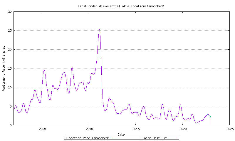 The approach used here to modelling overall address consumption levels is to use the RIR allocation information as the baseline of the address consumption model. This approach treats an address as "consumed" once it has been allocated or assigned by an RIR. The data used to construct the time series of allocations is the allocation "stats file" published on a daily basis by each RIR, placed into a time series, as indicated in Figure 9. The first order differential of the smoothed total allocation rate can be generated, as shown in Figure 27. A least squares linear best fit can be generated for the recent part of this data.
